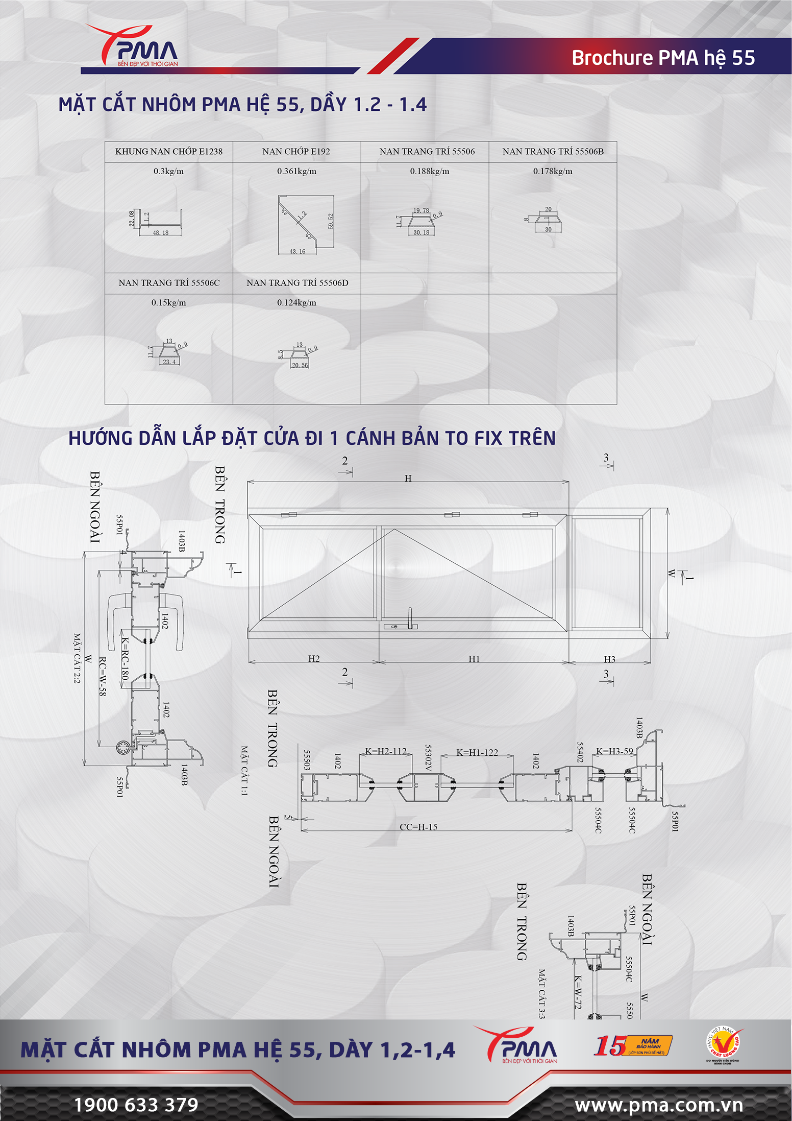 Cửa đi mở quay PMA hệ 55 Vát cạnh là sản phẩm được làm từ nhôm hệ 55, có độ dày khoảng 1,2mm đến 1,4 mm. được đùn từ billet nhôm đạt tiêu chuẩn 6063-T5.