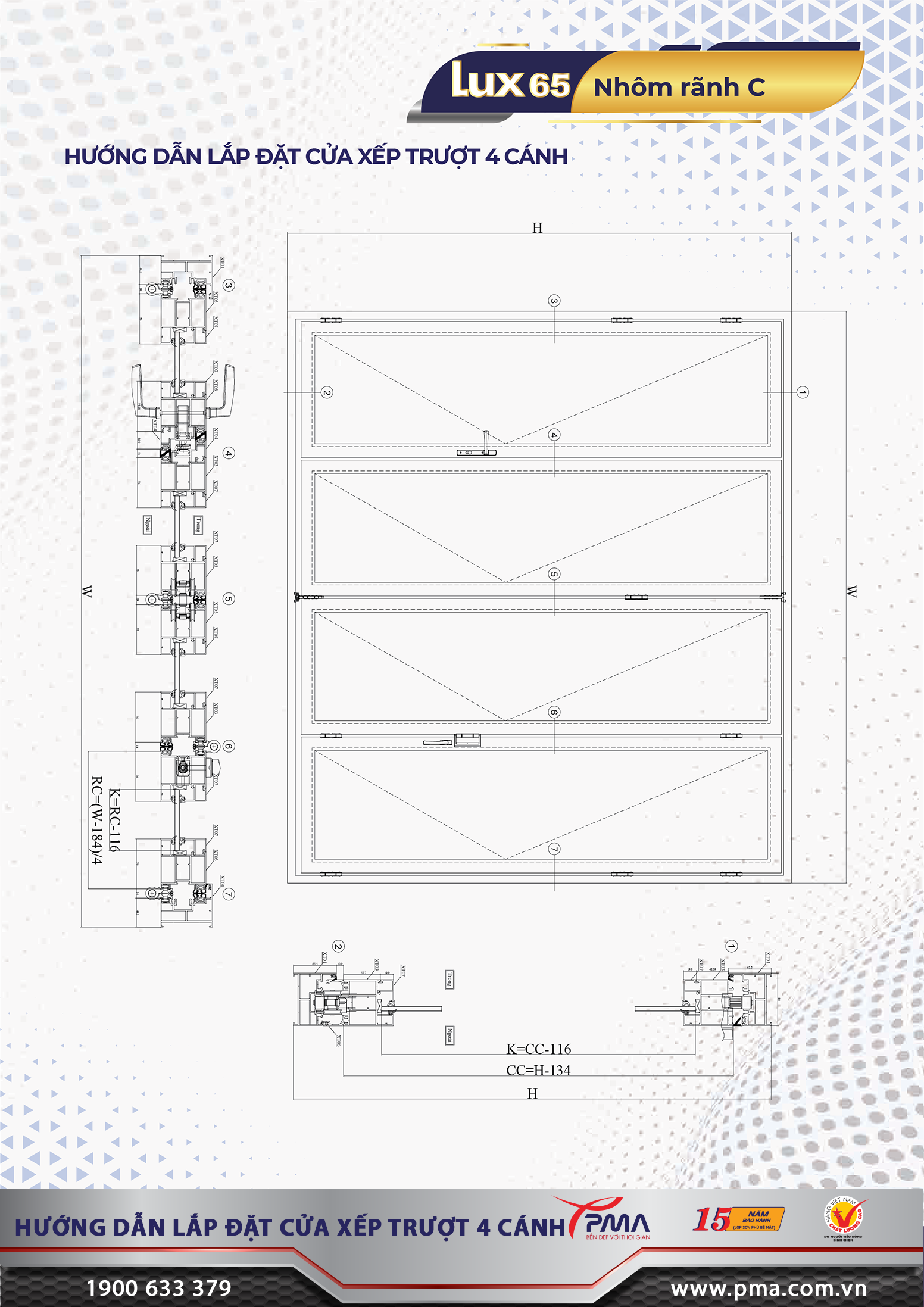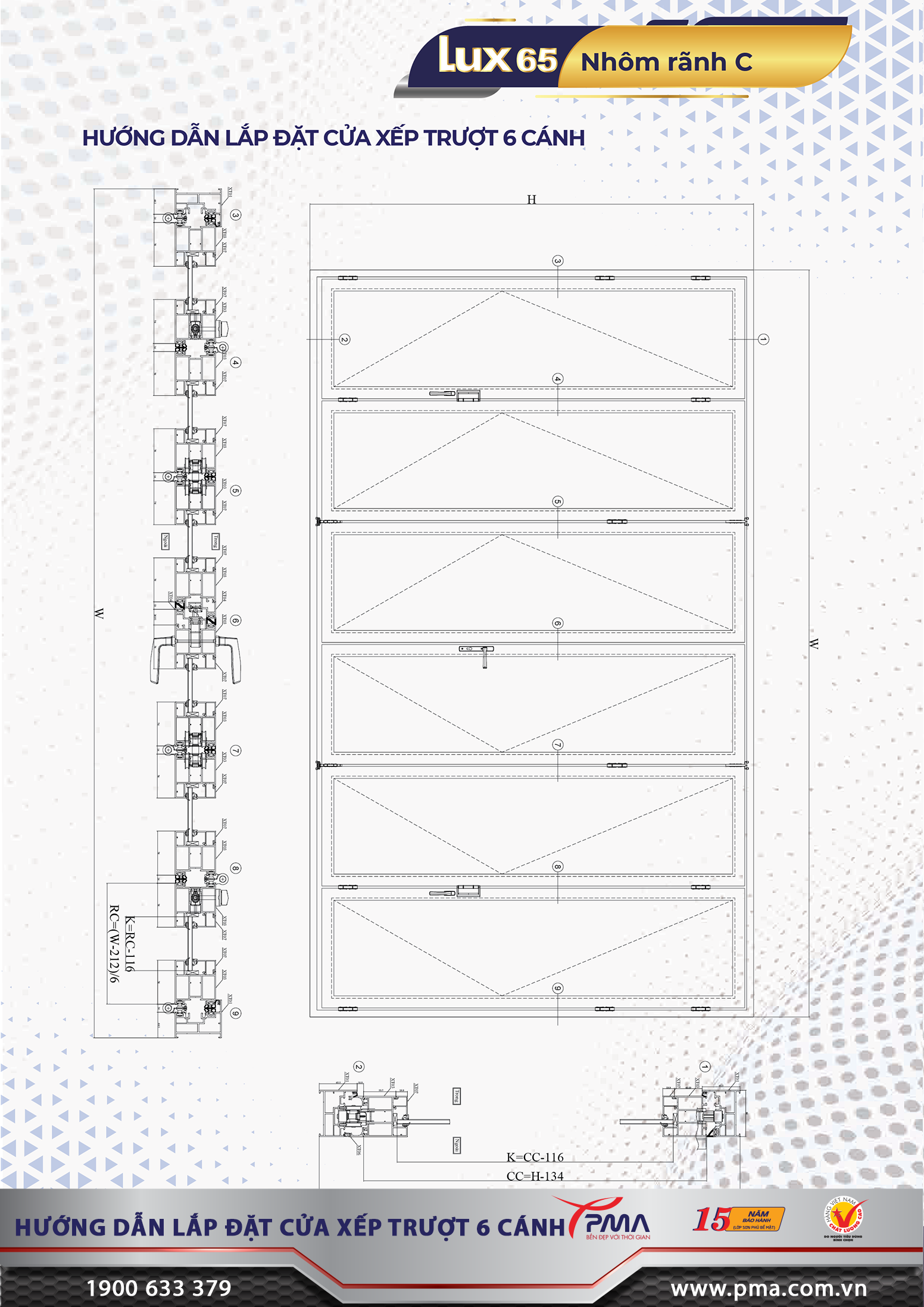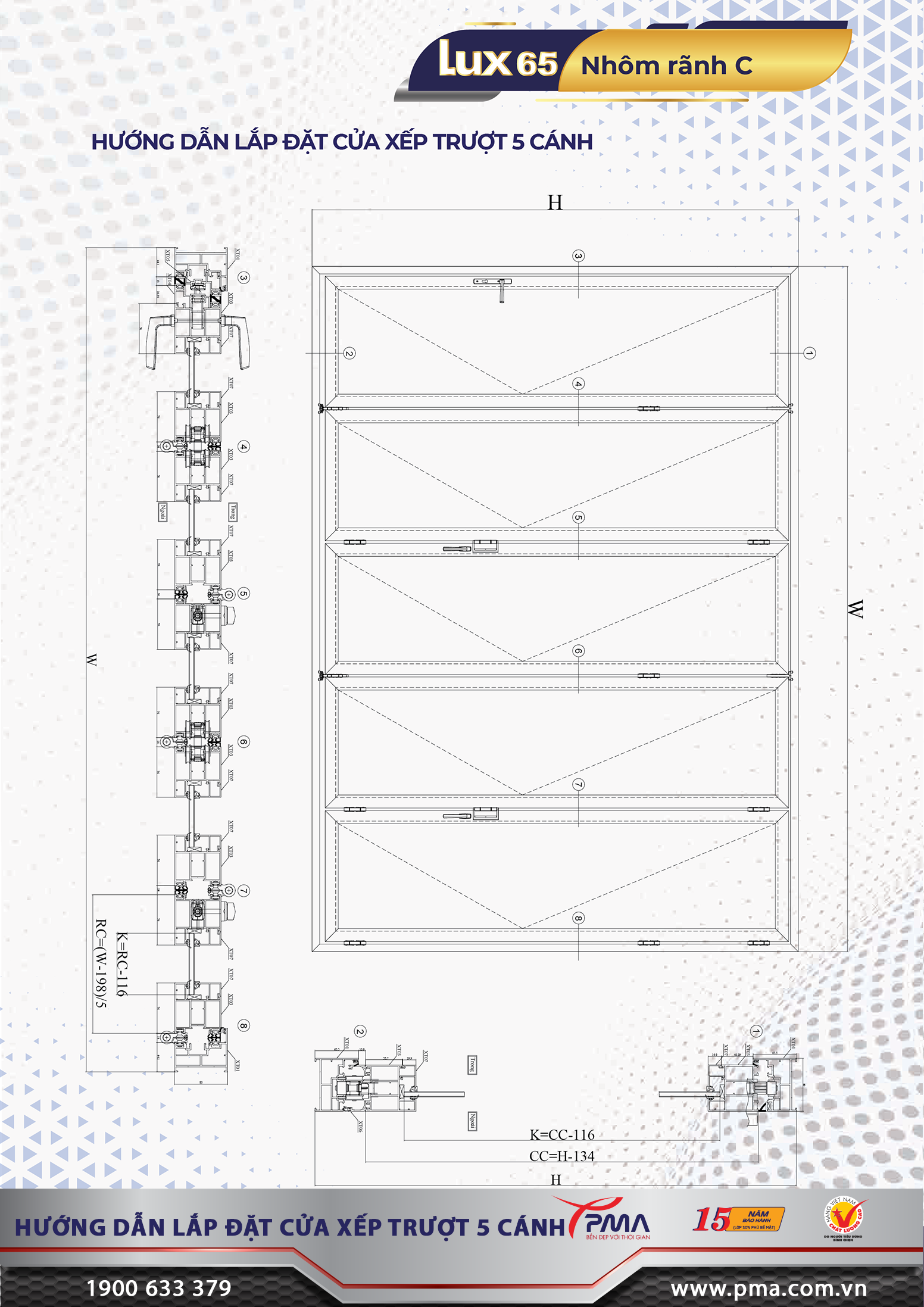 Cửa đi PMA Lux65 hệ xếp trượt 80 rãnh C tiêu chuẩn châu Âu có thể thiết kế từ 3 đến 6 cánh với chiều cao lên đến 3,5m và chiều rộng mỗi cánh hơn 1m, mỗi cánh của cửa đi xếp trượt có thể chịu lực lên tới 320kg đảm bảo độ bền và chắc chắn trong từng sản phẩm.