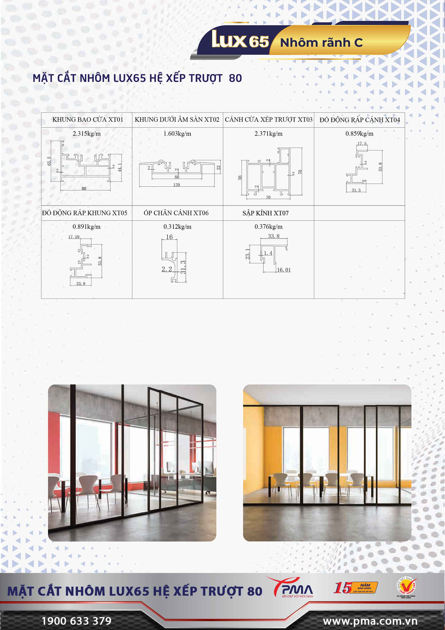 Với nhiều ưu điểm vượt trội, dòng Cửa đi PMA Lux65 hệ xếp trượt 80 rãnh C tiêu chuẩn châu Âu đáp ứng đầy đủ mọi tiêu chi khắt khe nhất. Để biết thêm về sản phẩm, quý khách xin vui lòng liên hệ đến:
