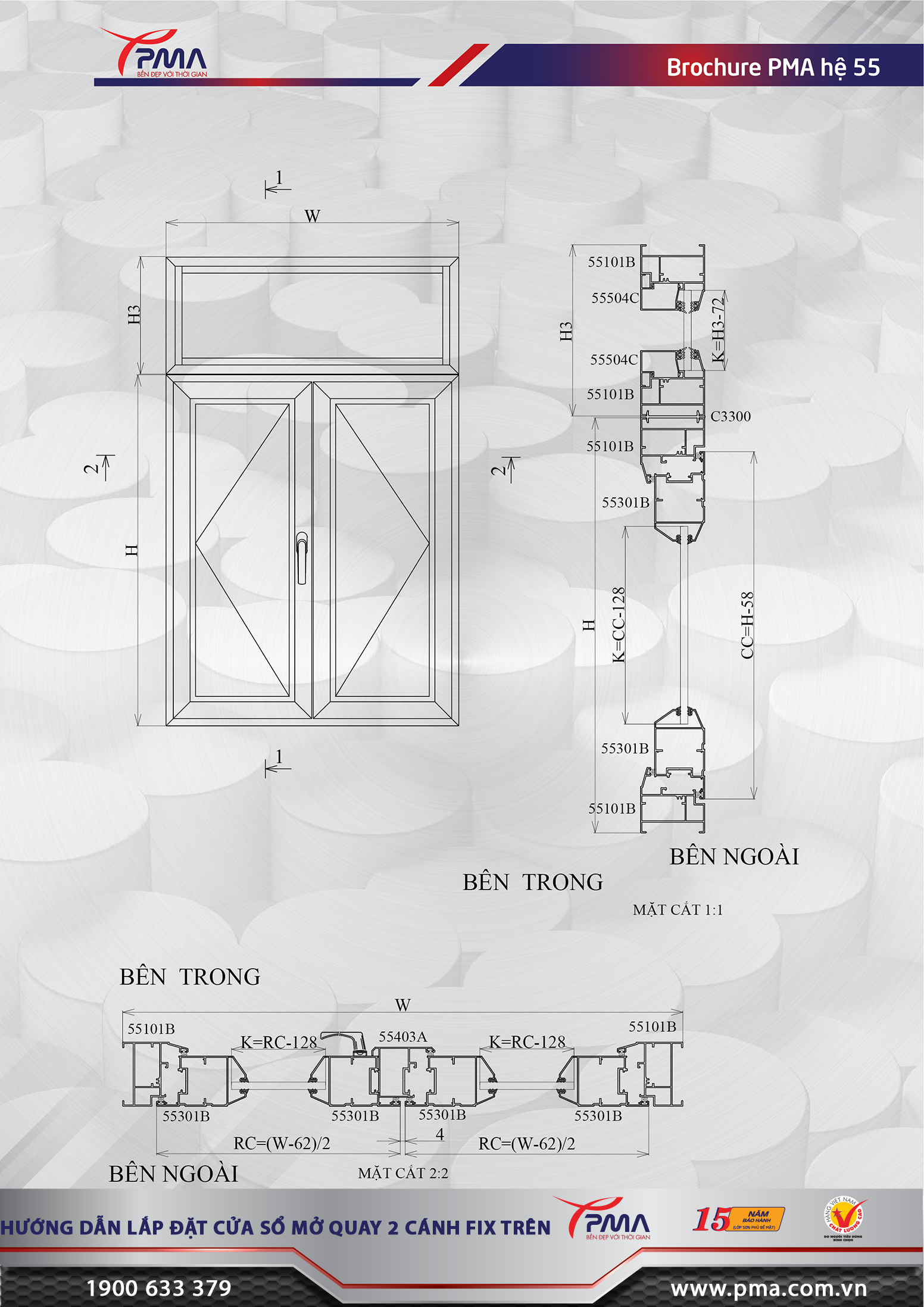 Cửa sổ mở quay PMA hệ 55 Vát cạnh thường sản xuất và lắp đặt 1, 2, 3 hoặc 4 cánh.