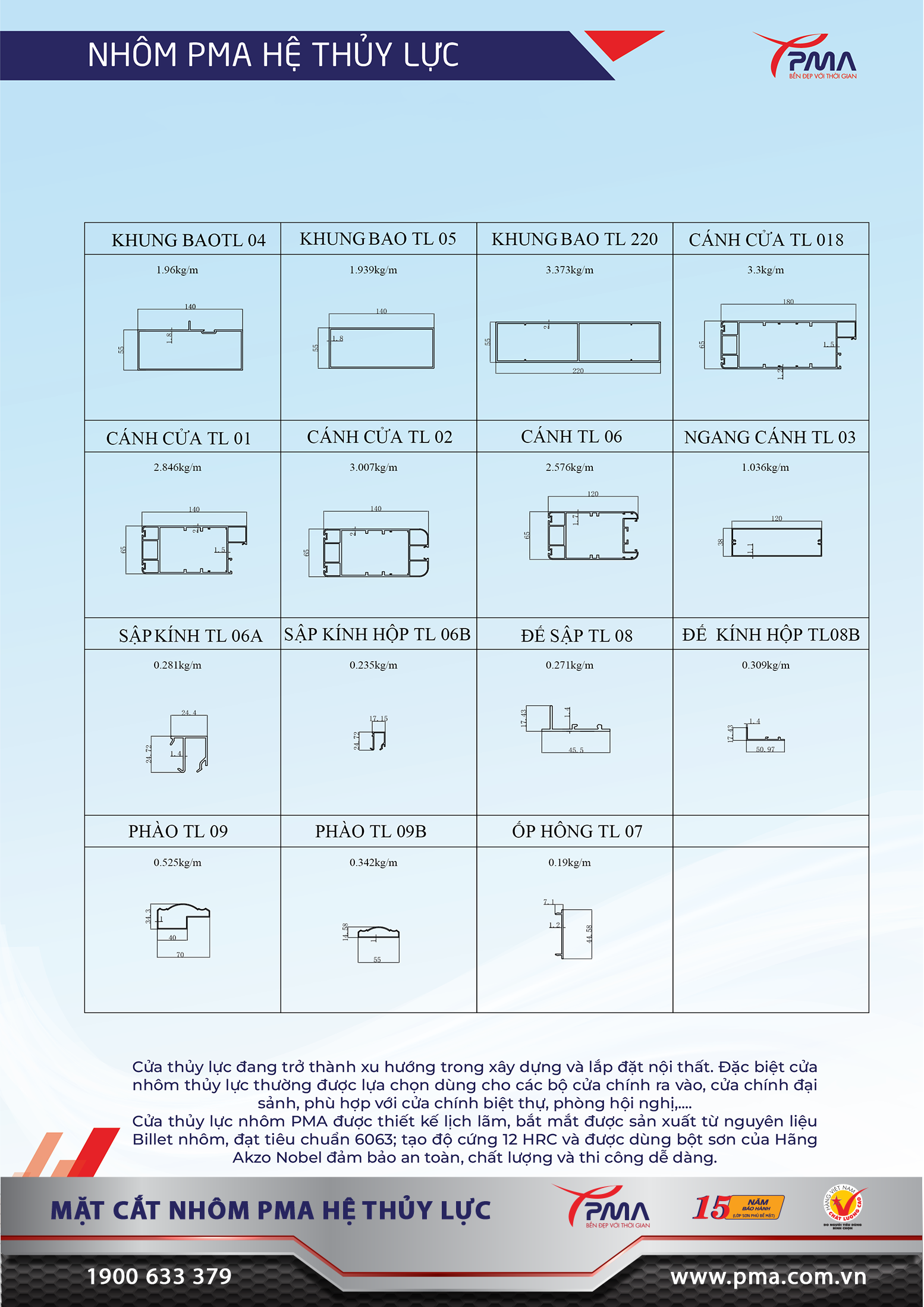 Mẫu mã đa dạng, độ bền vượt trội, khung nhôm sang trọng với tính thẩm mĩ cao, cửa Thuỷ lực PMA màu vân gỗ được đánh giá rất cao, góp phần “nâng tầm” vị thế cho mọi công trình. Mọi chi tiết xin quý khách vui lòng liên hệ đến: