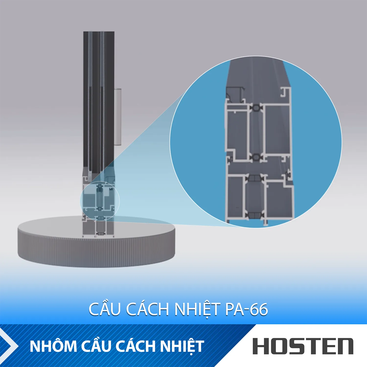 Nhôm cầu cách nhiệt HOSTEN với cấu tạo 3 lớp gồm 2 thanh profile nhôm định hình được gắn kết bằng cách nhiệt sử dụng nhựa PA66 (cầu cách nhiệt) ở giữa, dải Polyamide (PA66) không chỉ giữ vai trò làm cầu nối vật lý giữa 2 lớp nhôm, mà còn có khả năng phá vỡ sự truyền nhiệt từ lớp nhôm bên ngoài vào lớp nhôm phía trong của cánh cửa, giúp tăng khả năng cách nhiệt của nhôm cầu.