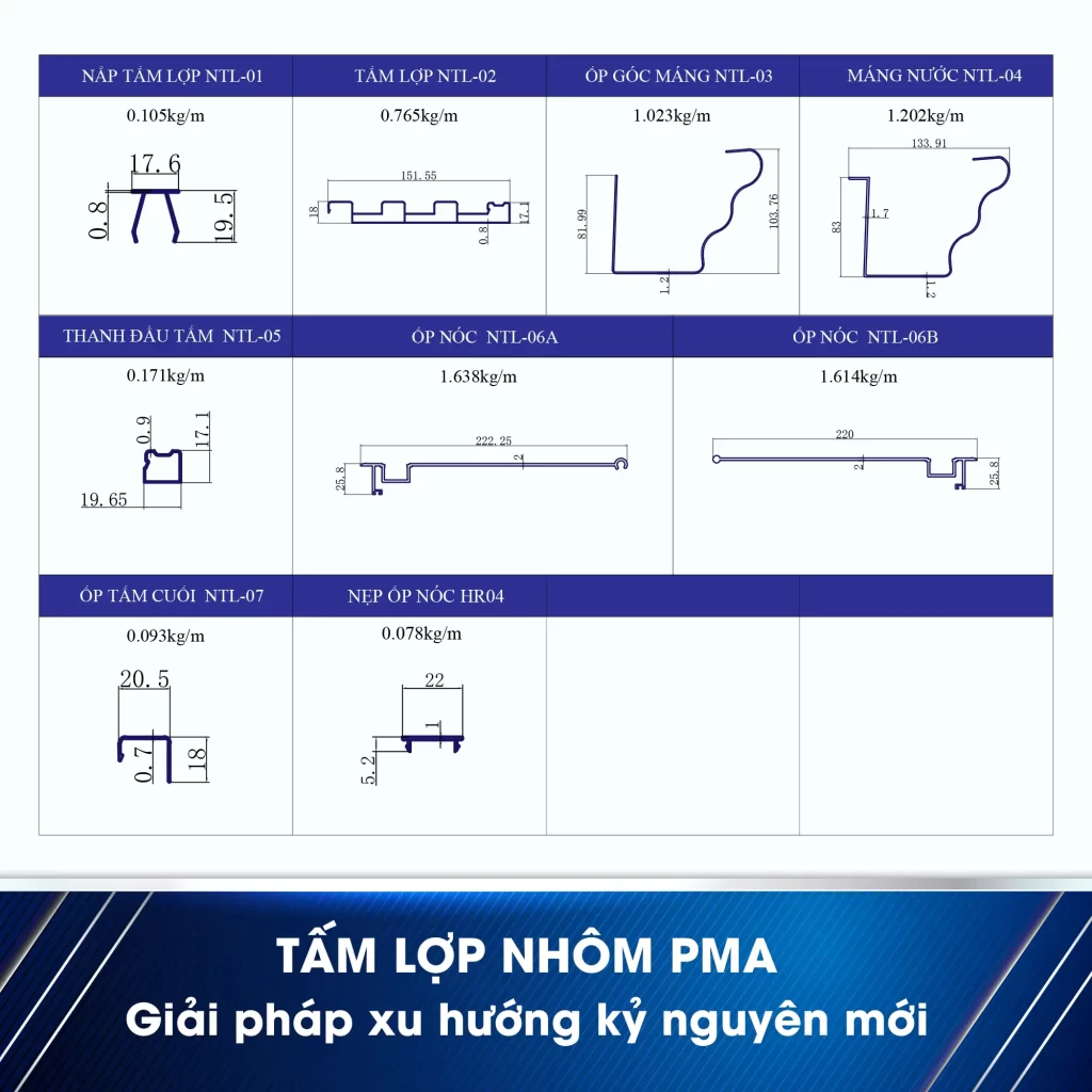 Tấm lợp nhôm PMA đi kèm hệ thống phụ kiện đồng bộ, bao gồm: